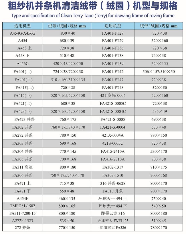我公司降重推出第九代新型高科技納米材料,粗紗機(jī)、并條機(jī)清潔絨帶(絨),真正做到了無靜電、抗靜電、無熒光、永不拉長、四條絨帶在清潔器上運(yùn)轉(zhuǎn)平穩(wěn)一致,而且不起棉結(jié)、清花效果比羊毛(白呢)和尼龍絨毛植絨帶提高了2倍,清花效果中有利的把附著在膠輥和羅拉上的短絨、飛花、雜質(zhì)清掉,使粗紗干條大大減少了游羽、圈羽現(xiàn)象,永不拉長節(jié)約了停機(jī)次數(shù),為粗紗車間每年節(jié)省用工17-21個(gè)工期,提高了效率,為紡織廠節(jié)省了開支。從前的絨帶全部有熒光,第九代絨帶真正做到了無熒光,在現(xiàn)代紡紗中,提倡紗線的綠色健康熒光實(shí)際就是化工化學(xué)產(chǎn)品而造成的,我們采用意大利進(jìn)口白棕樹棕毛,經(jīng)過12道工序制作當(dāng)前絨化,又開發(fā)了先進(jìn)的植絨機(jī)器,讓絨毛和底布結(jié)合的更牢固,如果絨帶上有熒光,就造成了絨帶和羅毛,拉摩擦產(chǎn)生靜電、起棉結(jié)現(xiàn)象,棉結(jié)落到粗紗干上,造成了很大的瑕疵,還有棉紗上有熒光,大大影響了染色有瑕疵、有異纖。新型高科技納米材料絨帶,它降低紗疵、提高成紗質(zhì)量,從而達(dá)到******高立,提高產(chǎn)品******化。